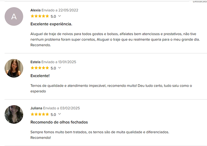 DEPOIMENTOS O Nosso Compromisso: Excelência e Cuidado em Cada Detalhe Os depoimentos de nossos clientes são nossa maior inspiração! É por eles que nos dedicamos de corpo e alma ao nosso trabalho, celebrando cada alegria e motivação que nos trazem. Temos o orgulho de manter um histórico de pouquíssimas reclamações no mercado de aluguel de roupas, com 99% de avaliações positivas. Essa estatística nos enche de satisfação, mas também nos motiva a nunca baixar a guarda. Temos o cuidado constante de não deixar que o sucesso seja motivo para a falta de investimento e aprimoramento contínuo das nossas relações pessoais, buscando sempre a excelência em cada interação.
